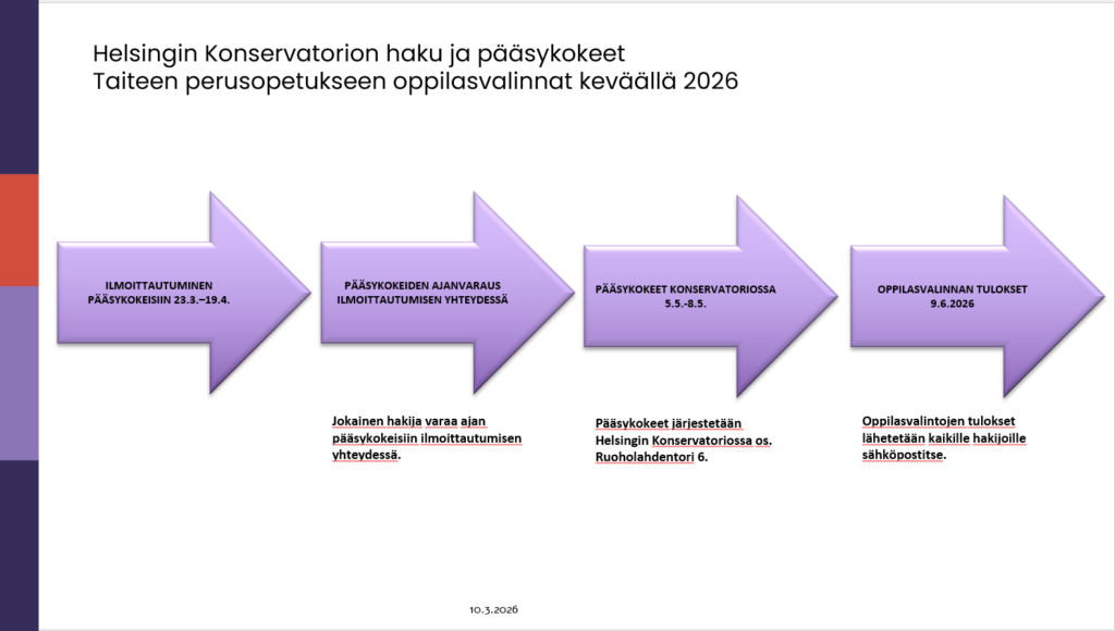 - saavu varaamanasi aikana pääsykokeisiin Helsingin Konservatorioon (Ruoholahdentori 6, ala-aula)