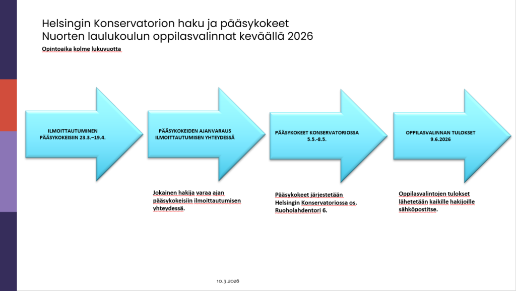 - saavu varaamanasi aikana pääsykokeisiin Helsingin Konservatorioon (Ruoholahdentori 6, ala-aula)