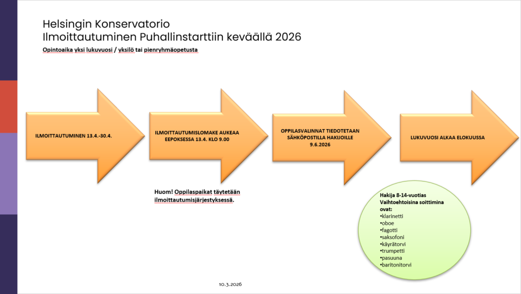 Puhallinstarttiin ilmoittaudutaan vain yhden kerran (ei hakemuksia eri instrumentteihin). Ensisijaisen soittimen lisäksi voit ilmoittaa myös vaihtoehtoisen puhaltimen.